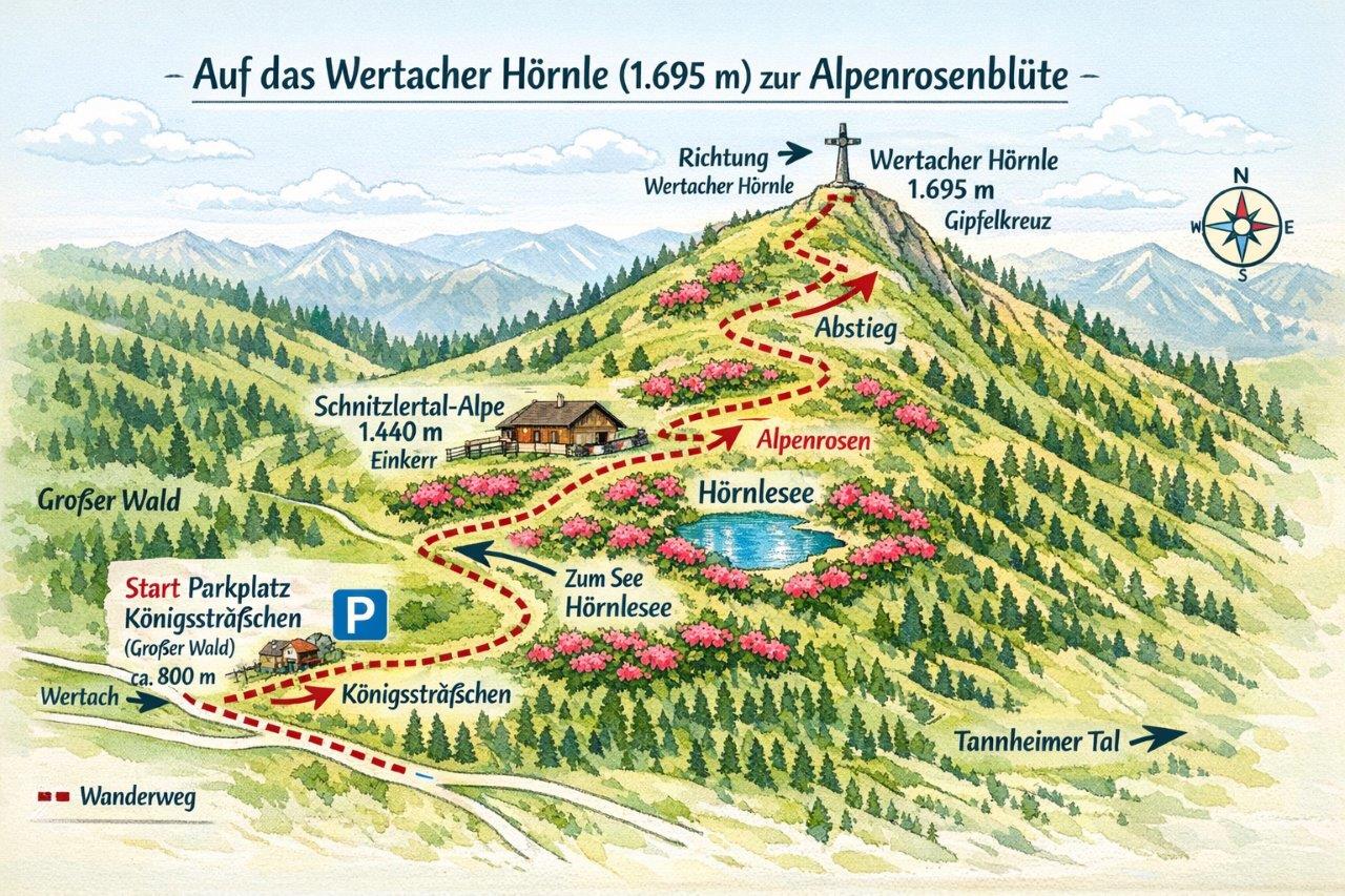 Die Alpenrosen färben dann die Berghänge in intensiven Rosa- bis rottönen. Das ist ein absolutes Selfie wert. Wertach ist bekannt für besonders üppige Alpenrosenbestände am Wertacher Hörnle. Diese Pflanze ist schwer geschützt, also Pflücken ist nicht erlaubt, aber anschauen, sich erfreuen und fotografieren.